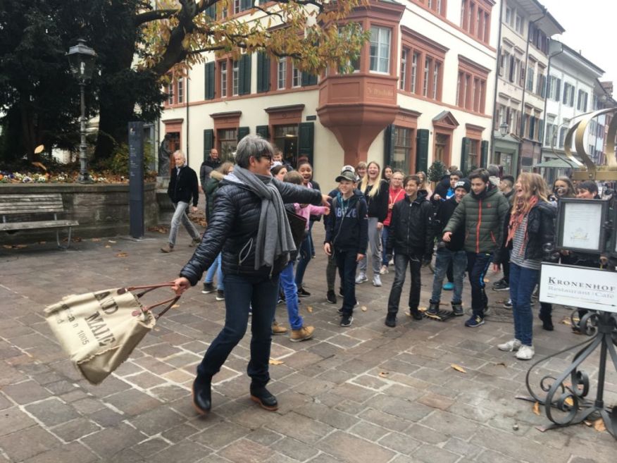 Am Donnerstagnachmittag, 15. 11. 2018, war eine skurril anmutende Gruppe von cirka 40 Oberstufenschüler/innen auf öffentlichen Plätzen in Rheinfelden anzutreffen. Unter der professionellen Anleitung von Christina Kuntner, Kulturschaffender des Kantons Aargau (remote citizen christian kuntner), interagierte diese Schülergruppe mit spontanen Kurzaktionen: anmutig, irritierend, amüsant. Am Bahnhof, bei der Sprengung vom Furnierwerkturm, in der Marktgasse oder im Migros – überall war diese seltsame Gruppe anzutreffen. Die Passanten zeigten sich erstaunt und interessiert, reagierten mit viel Witz auf Aktionen und wollten wissen, was diese Jugendlichen da eigentlich machen: „Sammeln die Geld? Wer leitet diese Gruppe an? Was ist das? Schau mal, dort ist derjenige, der ihnen per Knopf im Ohr Anweisungen gibt!“