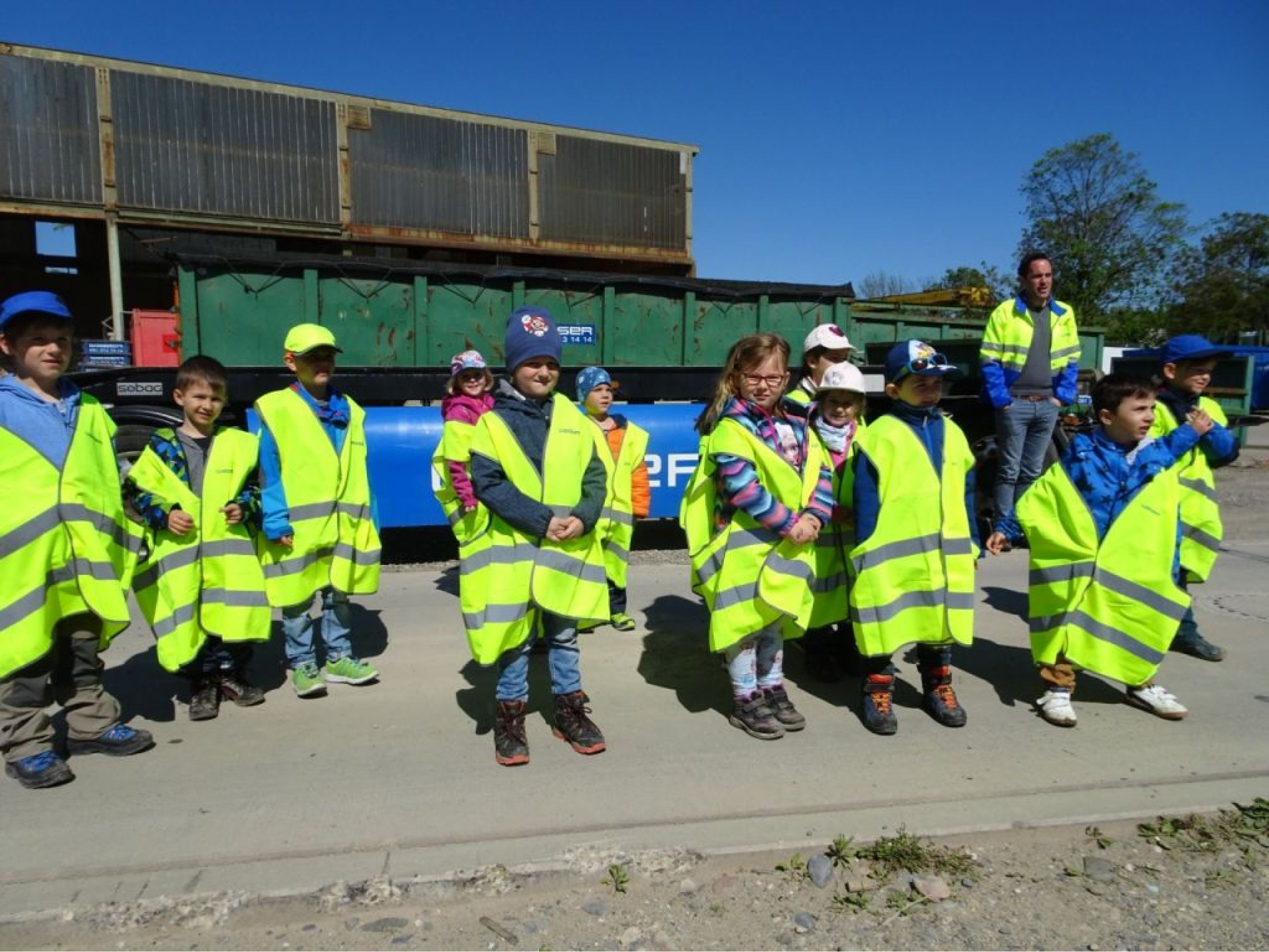 Zu Fuss starteten wir im Kindergarten Spielplatz und machten uns freudig und voller Neugierde auf den Weg durch die Quartiere, über Felder, an den Salinen vorbei, Richtung Rheinfelden. Philippe Moser von der Entsorgungsstelle erwartete uns bereits. Wir erhielten eine kurze Einführung, was die Aufgaben einer Entsorgungsstelle sind und die Kinder stellten viele Fragen. Schliesslich erhielten alle eine Leuchtweste, in denen sie regelrecht verschwanden, was ziemlich lustig war. Wir waren tatsächlich unübersehbar! Dann ging es endlich los. Voller Faszination beobachteten wir die verschiedenen Maschinen, mit denen Metall zerkleinert, Abfall sortiert, umgeladen und bearbeitet wurde. Wir lernten, was wie entsorgt werden muss, damit möglichst viel wieder recycelt werden kann. Wir erfuhren, dass Papiertüten eigentlich zum Karton gezählt werden und vieles mehr… Am Schluss durften die Kinder sich auf die grosse Waage stellen und brachten 330 kg zusammen, was einer Entsorgungsgebühr von 99.- Fr. entspricht:-). Schliesslich war der Hunger gross und wir grillierten an einer nahegelegenen Feuerstelle. Der Rückmarsch war dann etwas anstrengend, da die meisten Beine und Füsse schon recht müde waren. Es war ein ausgesprochen spannender und lehrreicher Ausflug! Danke an Philippe Moser und die Firma Waser für Ihre Grosszügigkeit und Gastfreundschaft!