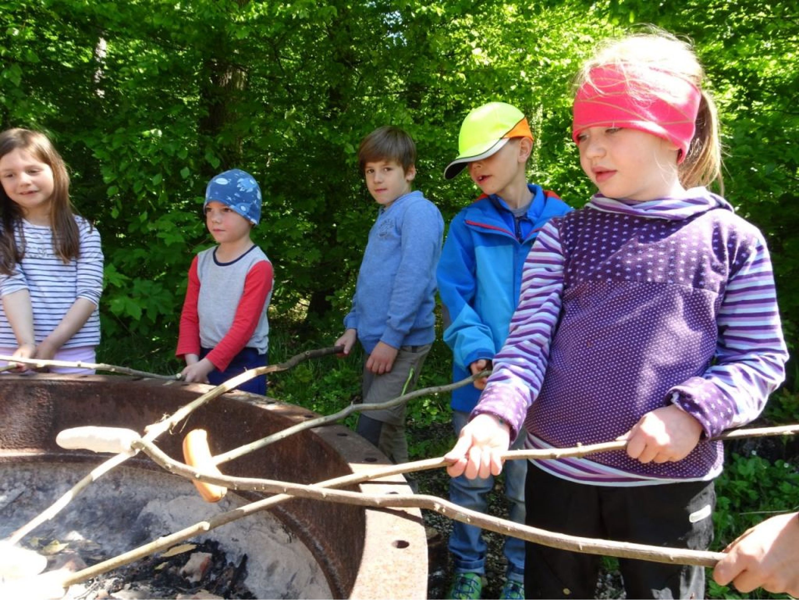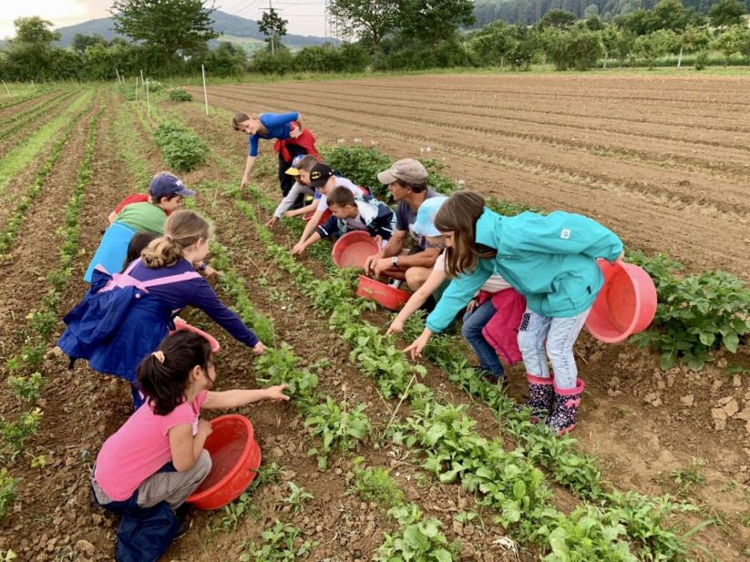 Als wir beim Beet unsere Arbeit geleistet hatten, ging es zu den Kirschbäumen, als „Apero“ durften die Kinder auf die Bäume klettern und Kirschen pflücken und essen. Danach gab es das Bauernznüni mit Most, Brötchen, Karotten, Randen, Apfelschnitzen und Kohlrabi. Nach einer kurzen Spielpause ging es danach wieder auf das Feld, um unser Dessert „Erdbeeren“ zu pflücken und zu essen.