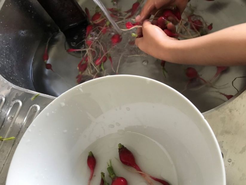 Als erstes ernteten wir die Radieschen. Danach jäteten wir bei den Karotten das Unkraut und lockerten die Erde auf. Nachdem die Karotten versorgt waren, ging es zu den Kartoffeln, dort lockerten wir die Erde und schaufelten die Erde danach unter die Pflanze, damit die Kartoffeln beim Wachsen gut mit Erde bedeckt sind. Jetzt wurde es lustig, wir suchten das ganze Beet nach „Kartoffelkäfern“ ab und sammelten diese ein, denn diese sind die Feinde der Kartoffelpflanze.